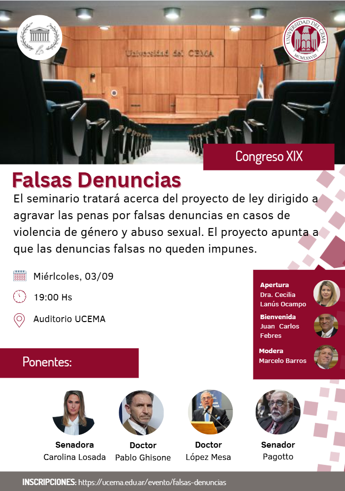 El seminario tratará acerca del proyecto de ley dirigido a agravar las penas por falsas denuncias en casos de violencia de género y abuso sexual. El proyecto apunta a que las denuncias falsas no queden impunes.